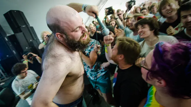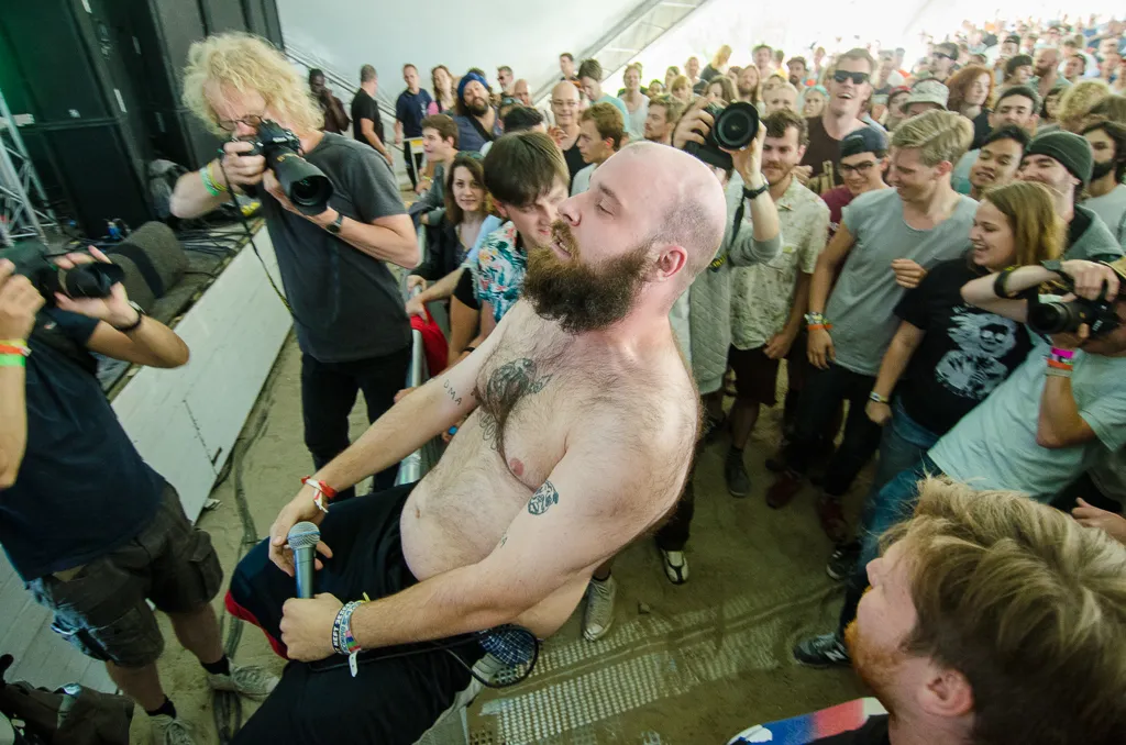 De Canadese hardcorepunkers van Fucked Up hebben wat elke band zou moeten willen hebben: een enorm goede, knotsgekke frontman in Damian Abraham (beter bekend als Pink Eyes). Die drie gitaristen, bassiste en drummer in Italiaans shirt doen natuurlijk ook mee, maar dit is de grote Pink Eyes-show. In het tweede nummer is de beer los: er staan liefst twaalf fotografen klaar in de pit voor de erkend fotogenieke Abraham, maar hij is er zo langs en klimt direct in het publiek. Acrobatiek, hardcoretrucjes als het publiek door de mic mee laten brullen en zijn vaste run door de bezoekers naar de P.A. achterin; het hoort er allemaal bij. Voor mensen als Abraham is de wireless mic uitgevonden, zou je zeggen.