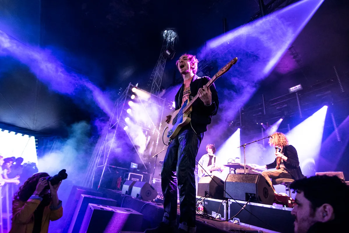 Een kwartier na aanvangstijd komen ze het podium op: de Mystery Jets. De heren waren in een flinke file beland. Op hun vrolijke gemoed heeft de gedwongen vertraging geen invloed gehad.
