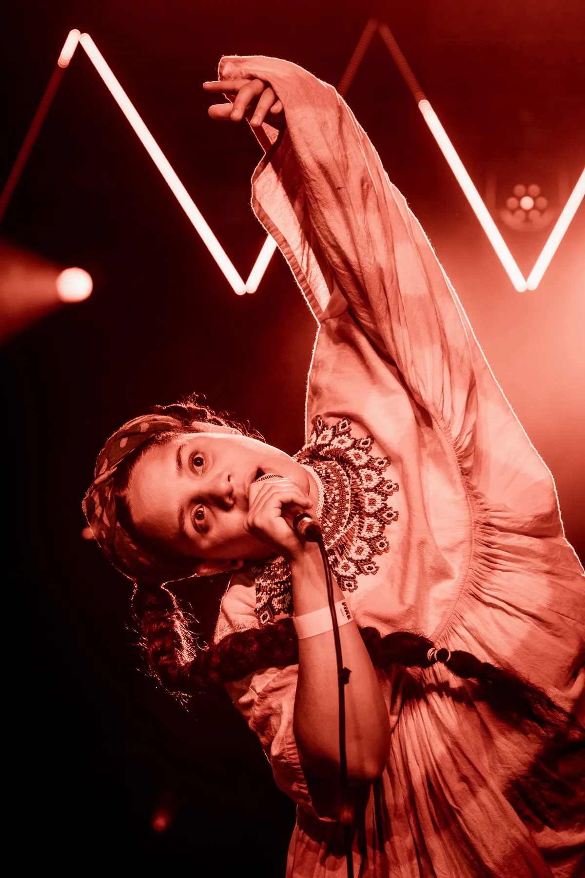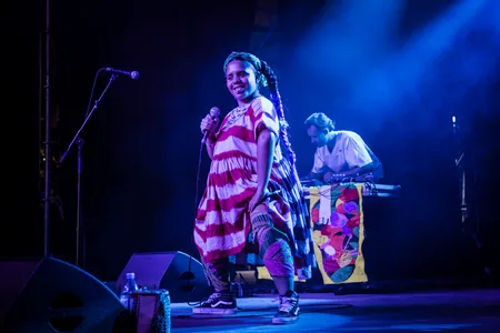 Wie van vandaag de show in Three zag, begrijpt dat ze won. Over electronica - soms priegelig, dan weer grof stuwend - zingt ze met dezelfde ongeremdheid als Björk op haar beste momenten. De vergelijking eindigt daar niet, want in haar melodieën grijpt Pimienta net als de IJslandse vaak terug op folk. Maar dan wel de Zuid-Amerikaanse variant. Het is dat ze zo nu en dan haar jurk op tilt op haar flinke buik te laten zien, want anders zou je haast vergeten dat ze zo ver zwanger is. Stuiterend door de razende percussie, draaft ze over het podium. Het ene moment met haar hoofd tussen haar benen, dan weer achterover leunend om nog wat harder te kunnen brullen over white supremacy.
