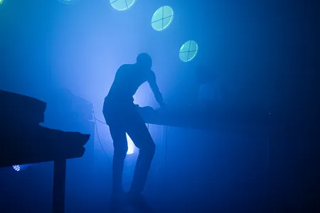 De jongen rechts bij de ingang houdt zich met twee handen vast aan een houten balk. Af en toe gooit hij zijn hoofd in de nek om naar lucht te happen en dan gooit hij voorzichtig twee handjes omhoog, om vervolgens weer snel houvast te zoeken. Pas na een kwartiertje laat hij nonchalant een hand los. Het zal vast het tijdstip zijn, de hitte en misschien net een beetje te veel van alles. Maar het is ook het geweld wat Giant Swan op het publiek los laat. Het duo kijkt elkaar recht aan, over een tafel vol apparatuur, voor twee oude gitaarversterkers. De rechter neemt het grootste deel van de apparatuur voor zijn rekening, headbangend schroeft hij de kicks alleen maar op en laat hij metaalachtige synths op elkaar inbeuken. Ondertussen gaat de ander, helemaal kapot. Zijn shirt al uit, en constant schreeuwend in een microfoon om vervolgens daar angstaanjagende loops van te maken. Heel af en toe samplet hij zichzelf zo dat het lijkt of er geen einde komt aan een doodsschreeuw. Net zo eng als opwindend, het type techno waar zelfs blackmetalfans zich in het zweet dansen.