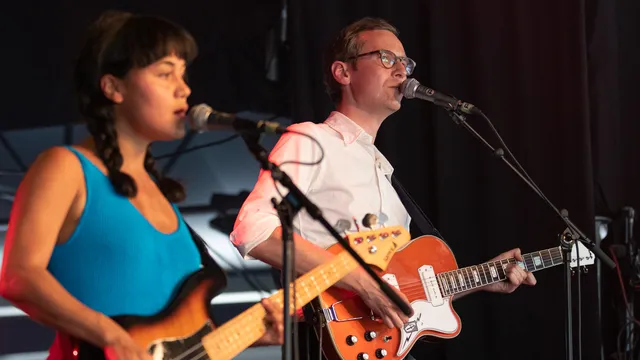 'Het is ons een genoegen uw amusement te mogen verzorgen op deze vroege zondagmiddag', zegt Van Vliet met een soort onderkoeld enthousiasme. Het genoegen is wederzijds, want dit optreden oogt ontspannen, maar er gebeurt ook echt wat. Mooi begin van een hete slotdag.