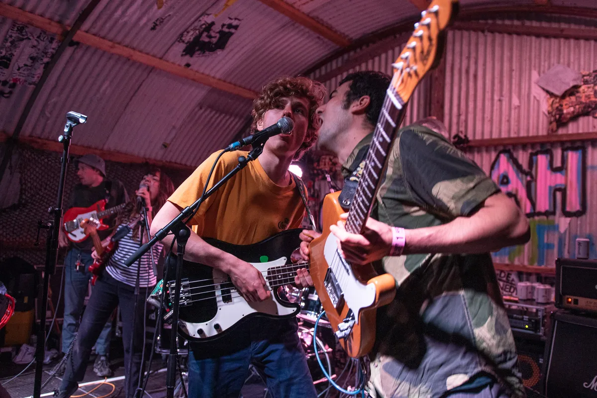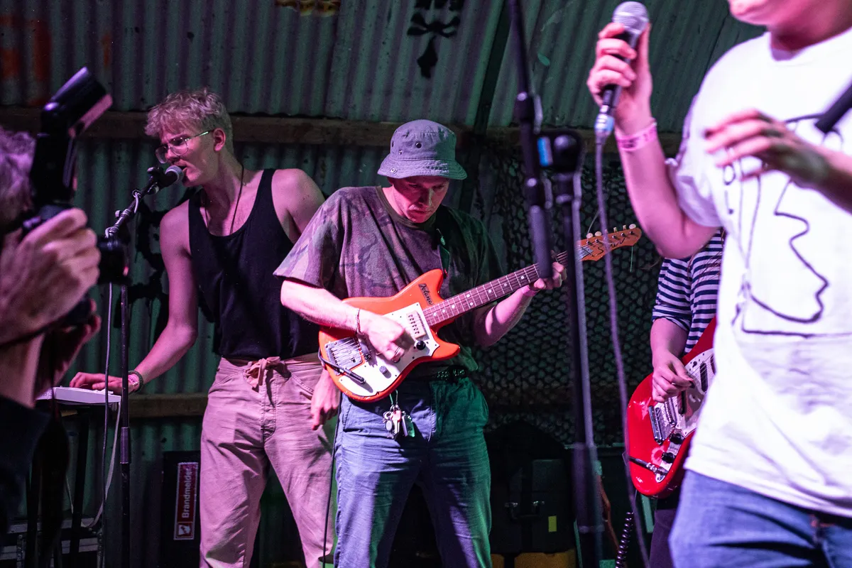 Ieder lid stuitert over het podium, langs elkaar heen of gewoon tegen elkaar aan. Stuk voor stuk blaffen ze wat teksten in een paar gedeelde microfoons en allemaal hebben ze het even goed naar hun zin. In bijna ieder snedig indieliedje van tweeëneenhalve minuut zit wel een verrassende wending. Van een keytar tot een scheidsrechtersfluit en van een koebel (die is aan een comeback bezig, mark our words) tot een megafoon met alarmfunctie: allerlei toeters en bellen komen vrij letterlijk voorbij.