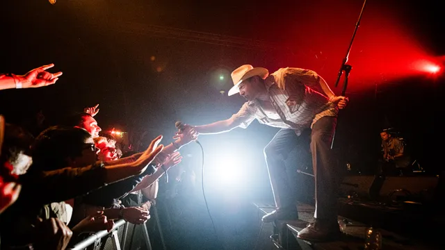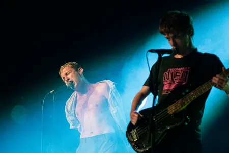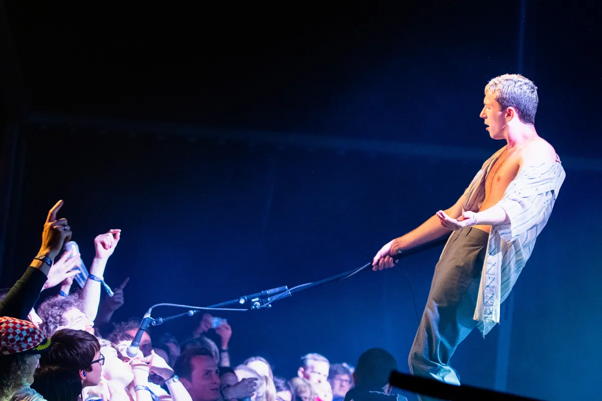 ‘The bigger the ego, the bigger the stage! Hehehehe!’ De cowboyhoed is ergens verloren en het shirtje is inmiddels uit bij Shame-frontman Charlie Steen – we zijn ook al drie nummers onderweg. Hij was altijd al een karikaturaal ventje, maar nu de podia groeien voor de Zuid-Londense post-punkband lijkt hij een regelrechte clown te worden. ‘Come on, give us your Dutch enthusiasm!,’ brult hij. De tong uit de mond gestoken, door de knieën naar achteren leunend en met zijn handen wapperend: ‘KOM MAAR OP!’ Hij wil cirkels zien, crowdsurfers en kolkende moshpits.