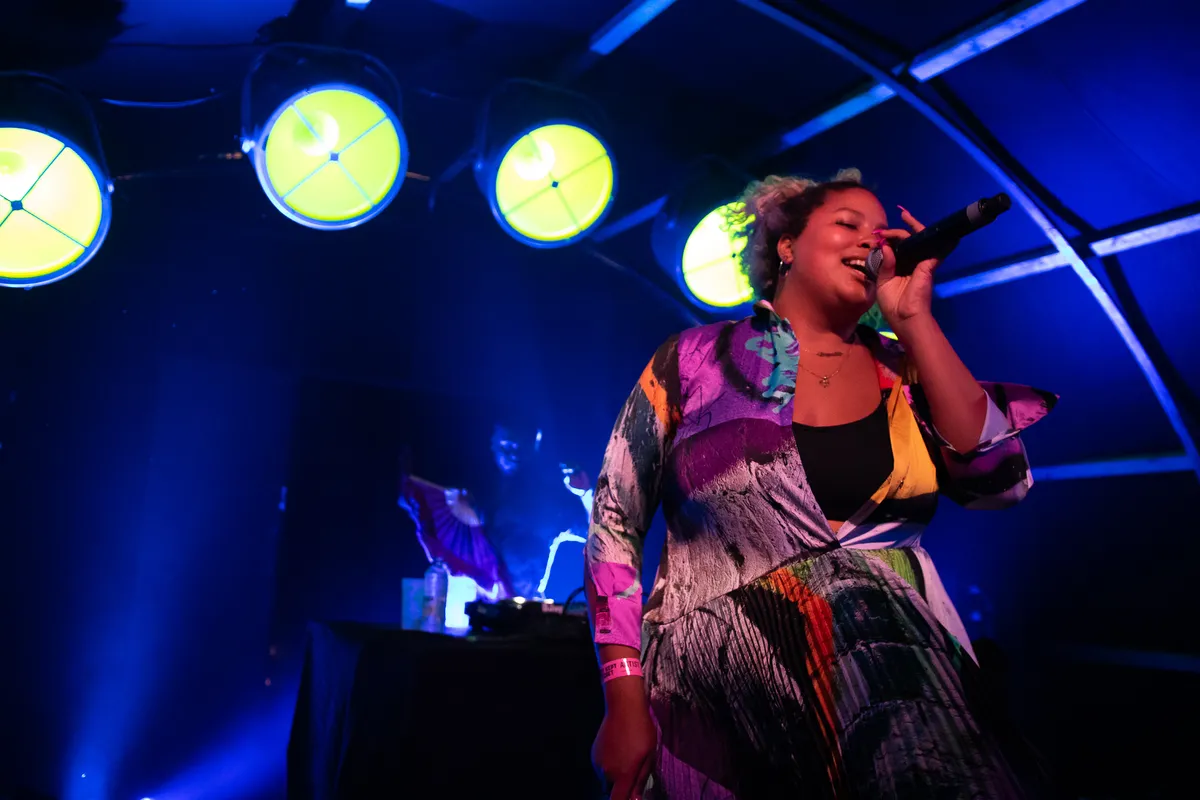 Terwijl Kraftwerk op het hoofdpodium nog toekomstvisioenen uit het verleden voorschotelt, fantaseert Shygirl in een desolate Seven alvast over 2050. Rapper en dj Blane Muise maakt onderdeel uit van NUXXE, een Zuid-Londens collectief dat sinds een jaar of vijf avant-gardistische elektronica maakt. Zo’n beetje in de hoek van de Nederlandse, maar in Londen woonachtige LYZZA en PC Music, de - u raadt het al - eveneens Londense platenmaatschappij wiens kopstuk SOPHIE de definitie van muziek later vandaag nog opnieuw uit zal vinden in de Two.