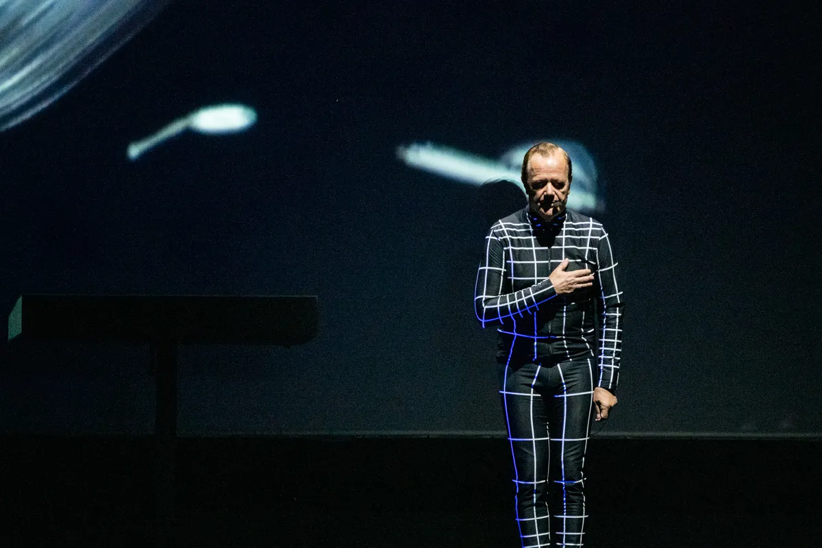 72 is Ralf Hüter (de meest linker op het podium) en hij is het enig overgebleven oorspronkelijke Kraftwerklid. Al zegt dat ook niet zo veel. Het jongste lid zit er dan wel pas sinds 2012 bij, maar is dan ook alleen verantwoordelijk voor de visuals tijdens optredens. De andere twee zitten al bijna dertig jaar in de band, dan voelt zo’n hele wel of niet origineel lid ook wat misplaatst. Nog een reden waarom het niet uitmaakt: nog altijd speelt Kraftwerk met het beeld van de elektronische muzikant. Wat doen ze nou eigenlijk achter die statafels? Je ziet de schouders druk bewegen, handen van links naar rechts gaan. En je hoort ook duidelijk melodieën ter plekke ontstaan, er is altijd iets van variatie in alle lagen. Ze zetten zich dan wel neer als Robots, of mensmachines, maar het menselijke element is wel zo belangrijk voor Kraftwerk dat er altijd een risico is dat er iets misgaat of net verkeerd valt.