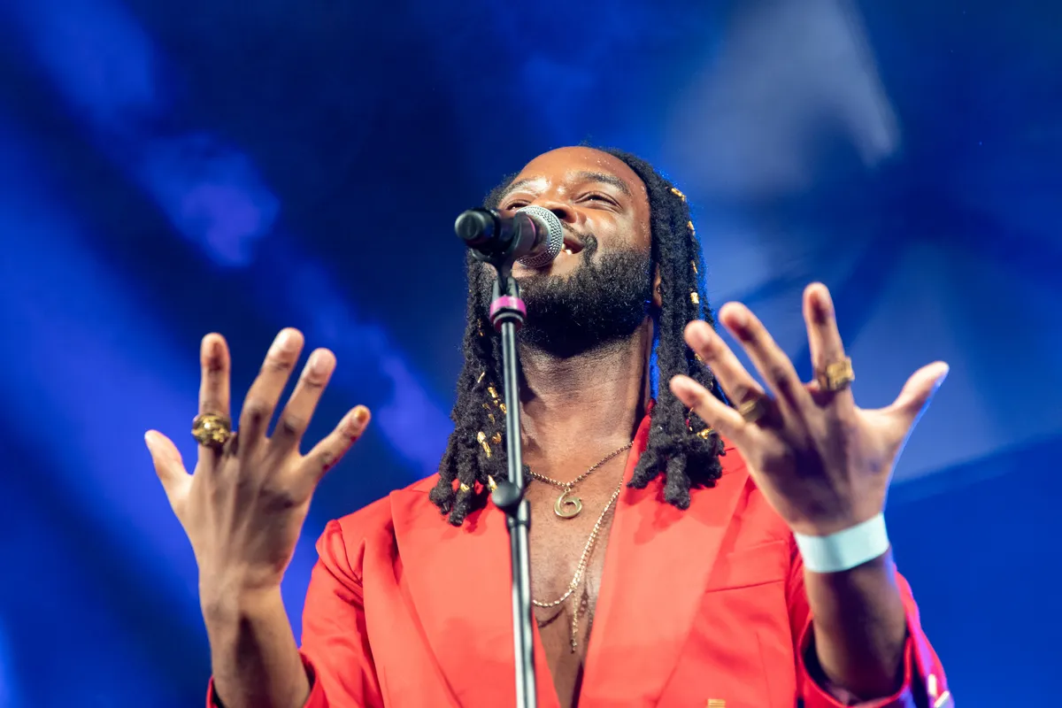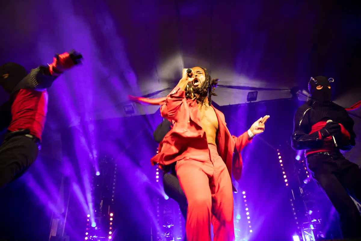 Die dubbelzinnigheid zit ook in zijn optreden hier op Best Kept Secret. Owusu begint zijn show alleen, gekleed in een schitterend rood pak zonder shirt, maar al snel wordt hij geflankeerd door drie dansers met zwarte superheldenmaskers. Of bivakmutsen. Of fetisj pakjes. Ze dragen ook nog eens twee vlaggen met zich mee. Wat daar op staat, daar komen we na een paar nummers achter: Don’t Forget to Smile. Het voelt als een overval door een stel jokers. En dan gaan de maskers af en komen me toch een paar gul lachende gezichten tevoorschijn. Het is een verbeelding van het centrale thema van dat debuutalbum: de angstige en soms kwaadaardige manier waarop een zwarte man in een witte wereld bejegend wordt.