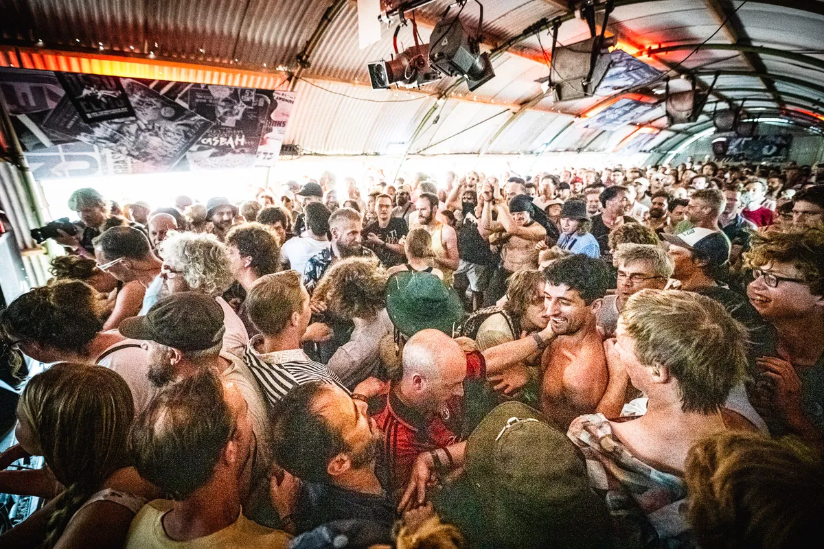 Bij het vallen van de avond begint eindelijk de verzengende hitte op het Best Kept Secret-terrein wat af te nemen. Dus wat doen we: we duiken de Casbah in voor een Noorse hardcore punkband om het vuur nog een laatste keer op te poken. Hammok heten ze, niet te verwarren met het hangmatmerk. We zagen ze al vlammen op Eurosonic en weten daardoor ook al dat je vooraan moet staan als je hun piepkleine zanger wil zien. Zijn stem reikt makkelijk tot achterin de Casbah.