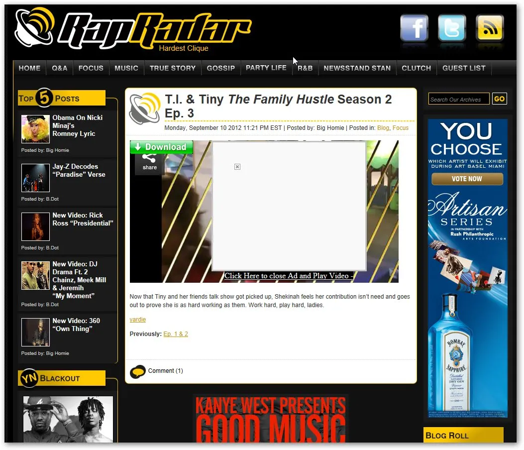 Over zo’n beetje ieder denkbare genre kun je blogs vinden, zeker ook over hiphop. Je kunt terecht op sites als NahRight, XXL en dit Rap Radar, waar alle nieuwtjes, videoclips, mixtapes en verse talenten uit de Amerikaanse hiphop langs komen. Hoewel hiphop in Amerika buitengewoon populair is in de hitlijsten, heeft het genre als geen ander het internet omarmd als de nieuwe straat, waar mond tot mond reclame een machtig middel is. Heeft president Obama commentaar op een lyric van Nicki Minaj over zijn concurrent Mitt Romney, dan zijn deze blogs er als de kippen bij.