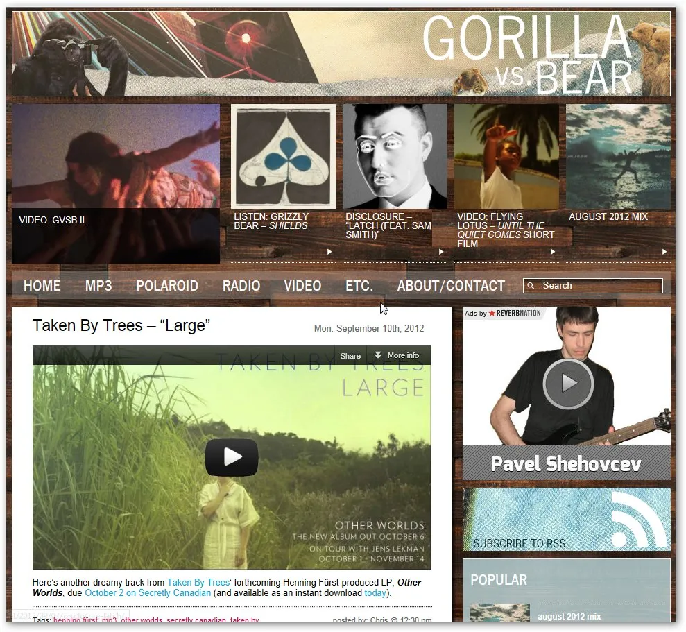 Chris Cantalini van Gorilla vs Bear heeft een neusje voor nieuw indie talent. Hij begon de site in 2005 alleen, na enige tijd geholpen door David Bartholow. Ze werken op een vrij traditionele manier: ze posten video’s of mp3’s, en voorzien die van kort commentaar. Opgepikt worden door Gorilla vs Bear is voor veel independent acts een mooie opstap naar bekendheid bij de grotere sites. Een goed voorbeeld dus van een onafhankelijke muziekliefhebber die een stevige keten in de blogosphere geworden is. Tip in dezelfde categorie: Disco Naivete (uit België!), door collega-bloggers geroemd omdat ie verdomd vaak de eerste is.