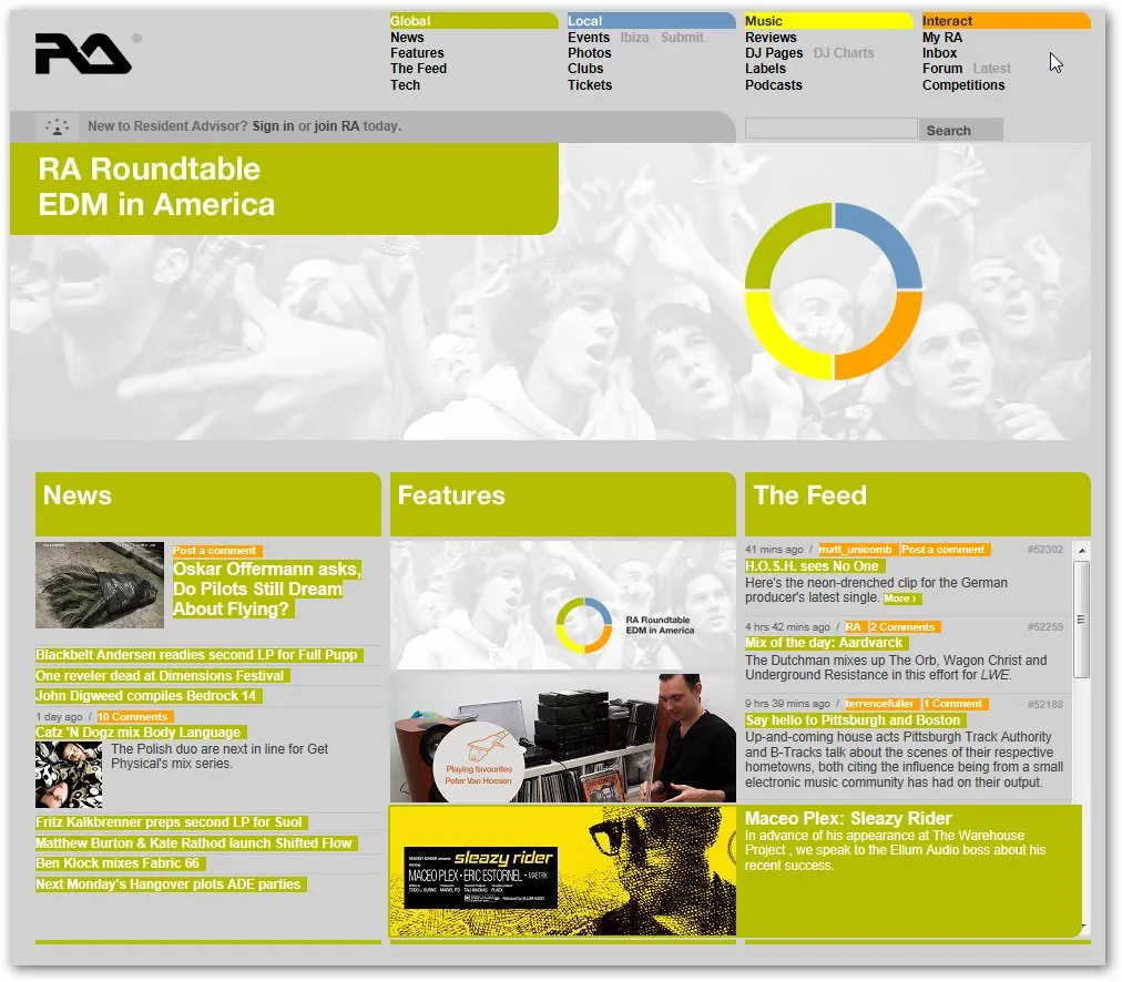 De belangrijkste website voor met name Europese elektronische muziek. En dan niet de grote stadion-dj’s, maar de undergroundacts, de frontrunners, de helden in de betere clubs, met de nadruk op techno. Bij Resident Advisor eindigt niet David Guetta, maar Jamie Jones, Seth Troxler en Richie Hawtin bovenaan de poll voor beste dj van het jaar. De site heeft weinig oog voor de glamour van het nachtleven, en focust tamelijk serieus op de muziek.