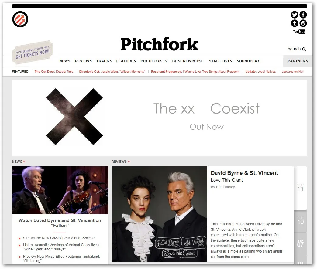 De onmiskenbare peiler van de wereldwijde online muziekjournalistiek is het Amerikaanse Pitchfork. De site bestaat al sinds 1995 en is buitengewoon invloedrijk, niet in de laatste plaats door de cijfers bij hun uitvoerige, nogal serieuze recensies. Tot achter de komma. Een 8,6 van Pitchfork kan een zeer obscure act zomaar op de kaart zetten. De site zit dicht bij het vuur, gevestigd in Chicago en Brooklyn, New York, maar wordt vooral ook uitstekend bediend door de labels.