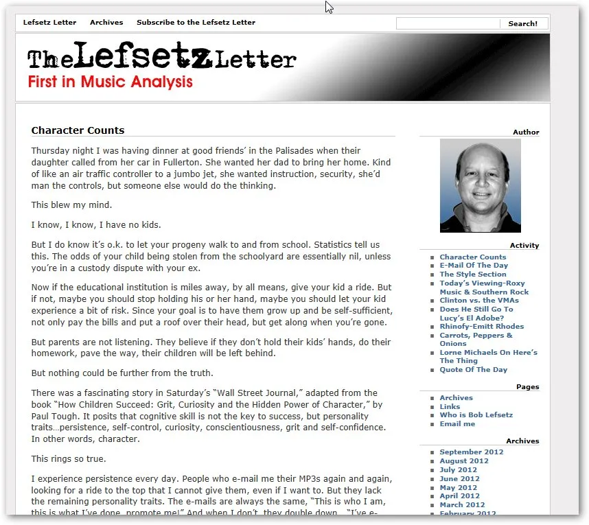 Hij is een enigma, de man met de scherpste pen van de muziekindustrie. Als je zijn teksten leest, zie je hem haast letterlijk voor je, als hij weer eens met het spuug van de opwinding op zijn lip een scherpzinnige analyse tikt. Het belangrijkste medium van Bob Lefsetz is zijn nieuwsbrief, waarop zeer prominente mensen uit de muziekindustrie geabonneerd zijn. Dat blijkt uit de vele reacties die volgens op zijn felle stukken. Die nieuwsbrief begon ooit letterlijk als een papieren mailing, maar heeft dankzij het internet de laatste jaren een vlucht genomen. Lefsetz’ stokpaardjes: Live Nation, de teloorgang van de major labels en stadionacts, de Grammy’s, The Eagles en Justin Bieber.