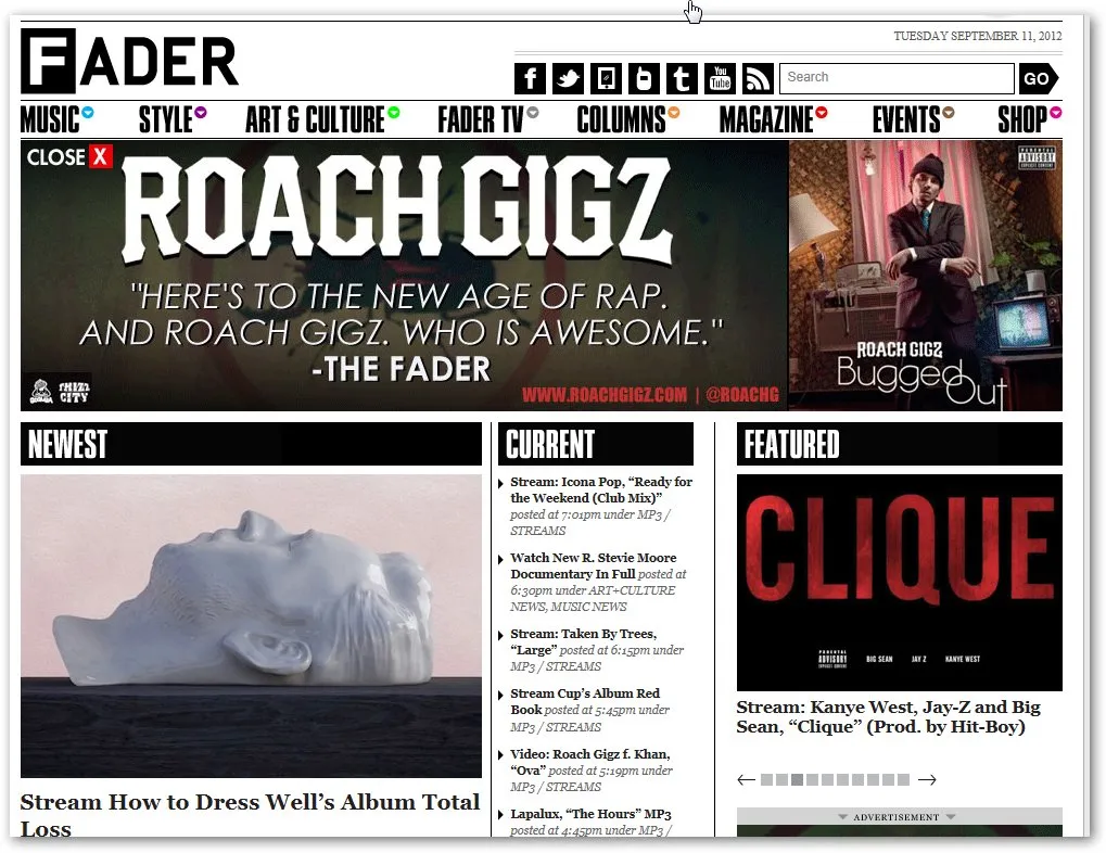 Tijdens het toonaangevende showcasefestival SXSW in Austin heeft The Fader altijd het meest imponerende feestje. Urenlang staan mensen in de rij om binnen te komen in het Fort. Fader is een papieren blad, maar hun website is minstens zo belangrijk. Dat blad heeft een opmerkelijke formule, met twee covers: aan de ene kant een indie-band (deze maand The xx), aan de andere een hiphop-act (deze maand Chief Keef).