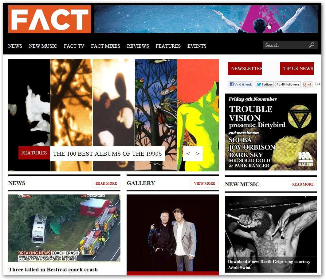 Het Britse online magazine Fact is vooral erg trots op zijn wekelijkse mixes. 346 zijn er inmiddels, met grote namen en nieuw talent van Carl Craig tot Kutmah tot Tensnake. De site heeft daarmee opmerkelijk veel plek voor elektronische muziek, naast de nieuwe bands en grotere namen uit het alternatieve circuit. De features van Fact zijn vaak behapbare Q&A’s of lijstjes (beste albums van de 90’s, etc). Een ander compleet magazine uit Engeland, wat nieuwer maar sterk in opkomst: The405.