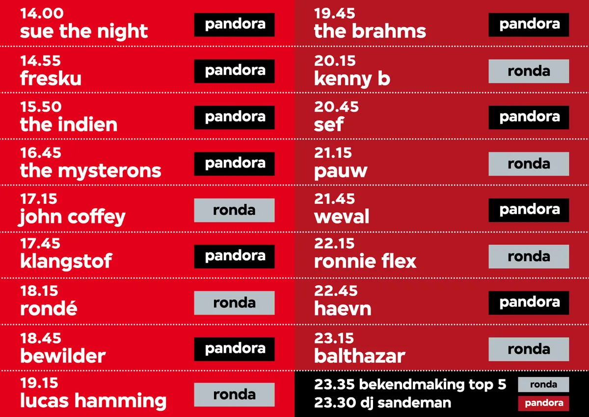 Nog even en dan is het zover: vrijdag weten we wie de Song van het Jaar 2015 heeft gemaakt! We vieren dat in TivoliVredenburg in Utrecht, met tussen 14.00uur en 00.00uur optredens van onder andere Balthazar, John Coffey, Fresku, Ronnie Flex, HAEVN en PAUW. In het blokkenschema hieronder vind je precies wie hoe laat en in welke zaal spelen, zodat je niets hoeft te missen. De gastenlijst is inmiddels gesloten, geen plekje geregeld? Kom gewoon naar TivoliVredenburg, vol is vol maar zo ver is het (nog) niet!