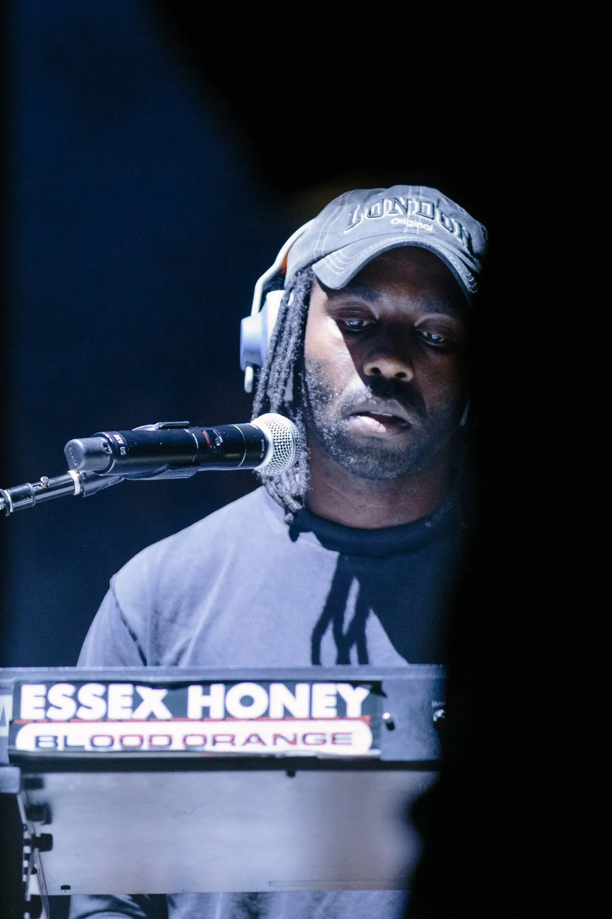 Eindelijk is daar het verlossende antwoord op de vraag die je al zeker een halfuur had: ja, je mag achter die rode koordjes staan, kom vooral! Tientallen vooral jonge fans laten zich dat geen twee keer zeggen en stormen het podium van TivoliVredenburg's Grote Zaal op. Het eerste concert van Blood Orange in Nederland sinds 2019 is vanuit 360 graden te bewonderen. Laat je niet misleiden door die spierwitte mic stand die op de traditionele publiekskant gericht staat: Dev Hynes is een multi-instrumentalist die bijna elk instrument dat tussen de cirkel van licht staat kan en zal bespelen.