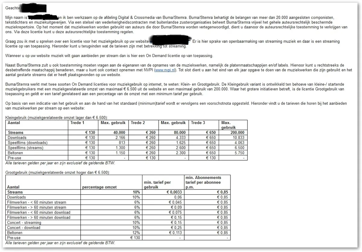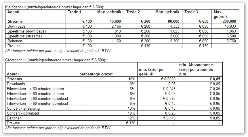 Ter illustratie de tarieven in het licentiemodel. Buma maakt onderscheid in Kleingebruik (muziekgerelateerde omzet lager dan € 6.500) en Grootgebruik (muziekgerelateerde omzet hoger dan € 6.500). Die indeling sluit vrijwel geen enkele site uit en past ook op sites die één filmpje en één advertentie online hebben staan. Bij Kleingebruik geldt voor streams tot 40.000 keer een tarief van € 130,-, tot 80.000 keer € 260, oplopend tot een maximum van € 650,-. Hoe het aantal streams vanaf een site gemeten moet worden wanneer de content niet op de site zelf staat (maar bijvoorbeeld bij YouTube) is niet duidelijk. Bij Grootgebruik wordt het tarief berekend als percentage van de omzet: bij streams is het 10% van de omzet, met een mimimum van € 0,0033 per gebruik en een minimaal abonnementstarief van € 0,85 per abonnee per maand. Er zijn aparte tarieven voor onder meer downloads, speelfilms, concerten, beltonen en pre-use. Klik voor de precieze tarieven op het plaatje hierboven en voor de hele brief onderaan.