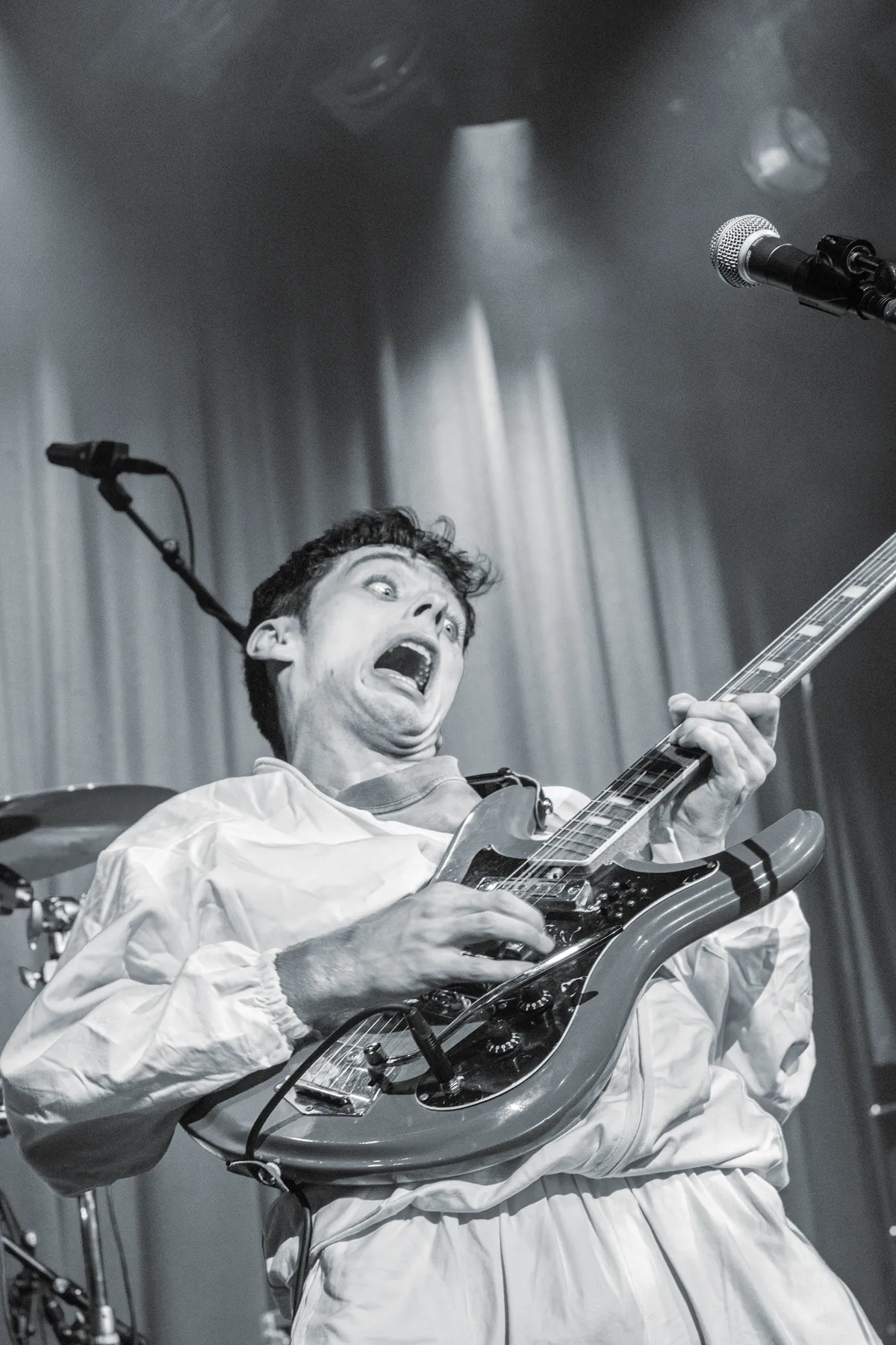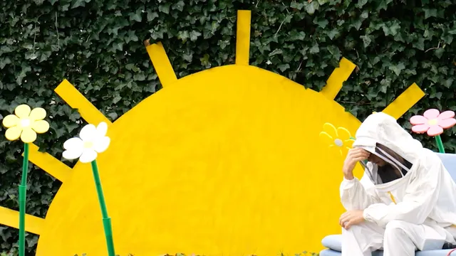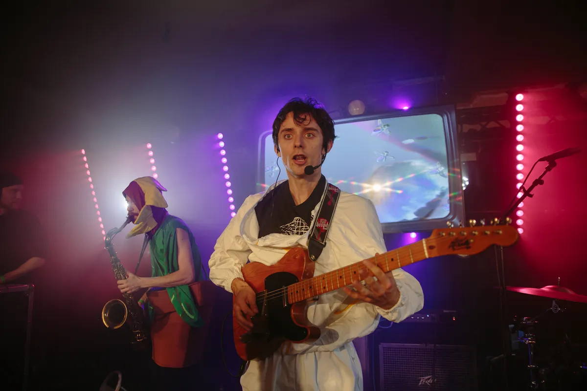 Maar zijn kinderlijke enthousiasme slaat om zodra hij begint te spelen: hij wordt hysterisch, trekt gekke bekken, het angstzweet druipt van zijn voorhoofd. Ondertussen vliegt er een zwerm bijen over het scherm, rent er een invasieve cameraman rond die niet alleen het zicht blokkeert maar ook nog eens iedereen over z’n kabels laat struikelen, gaat Bumble B. Boy van de zenuwen bijna over z’n nek op het podium én krijgt hij ook nog een ruzie met zijn saxofonist-in-bloempotoutfit. En dat allemaal terwijl hij er een set catchy kinderpunk doorheen blijft duwen. Ze zeggen wel eens dat je van oververhitting kan gaan hallucineren, maar dit was echt. Toch?