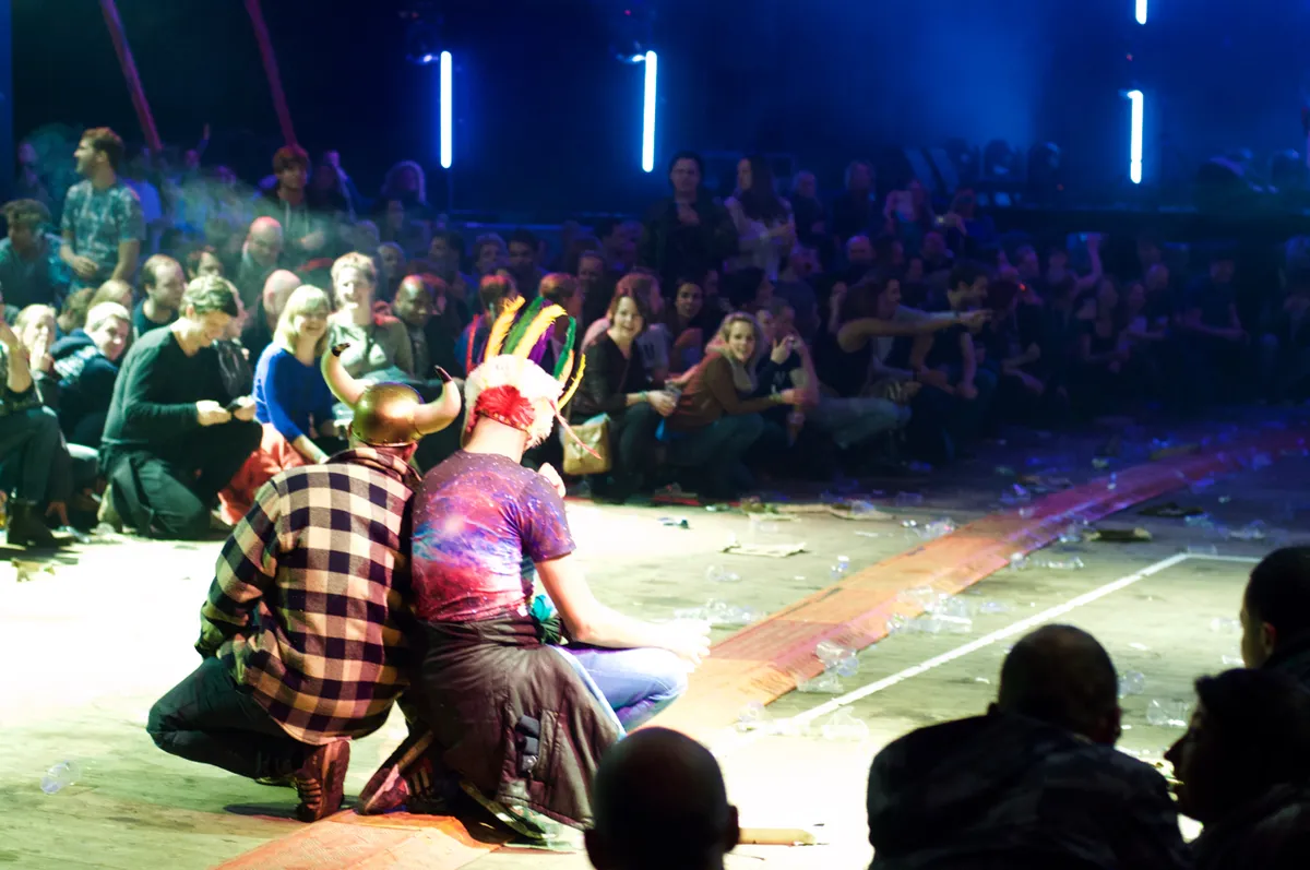 Het is jammer dat Larry Gus even daarna een parel voor de zwijnen blijkt: zijn gestoorde show in de Action Factory (een grote speelhal) komt pas op het laatst van de grond. Ook Petite Noir verzoop hier eerder op de avond, met een band die de subtiliteit van zijn album La Vie Est Belle / Life Is Beautiful live niet kon overbrengen. Nee, dan de show van Dan Deacon in de grote Willem Ruis-tent. Zijn 3voor12-sessie eerder op de dag was zonder publiek, hier in de tent zien we de geflipte Amerikaan in optima forma. Meteen al organiseert hij een dance-off in de grote tent, waarbij er steeds een danspaar bijkomt. Later is er nog een moment waarbij een stomdronken Viking en Indiaan een dansje moeten voordoen. Dat gaat helemaal de mist in, maar wat maakt het uit. Knap dat het Dan Deacon toch altijd lukt, met zijn toch niet heel makkelijk te behappen samplepop – pas tegen het einde van zijn set gooit hij er een four-to-the-floor in.