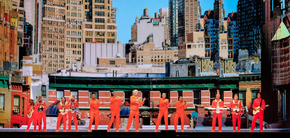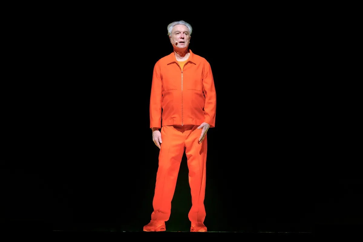 David Byrne is altijd een nieuwsgierige man geweest, die zijn inspiratie putte uit de vele culturen van zijn stad New York en van de wijde wereld. Dat is niet anders nu hij 73 is. Hij en zijn band zijn zojuist als een knaloranje fanfare uit de coulissen gestapt: dynamisch en voortdurend in beweging. Hij heeft de avond klein geopend met Talking Heads liedje ‘Heaven’, een ode aan de verrassing en de chaos. En inmiddels flitsen op de grote schermen beelden van vreemde vogels uit het New Yorkse straatbeeld langs, op eenwielers, met zestien honden, in een ronddraaiend rad in het park.
