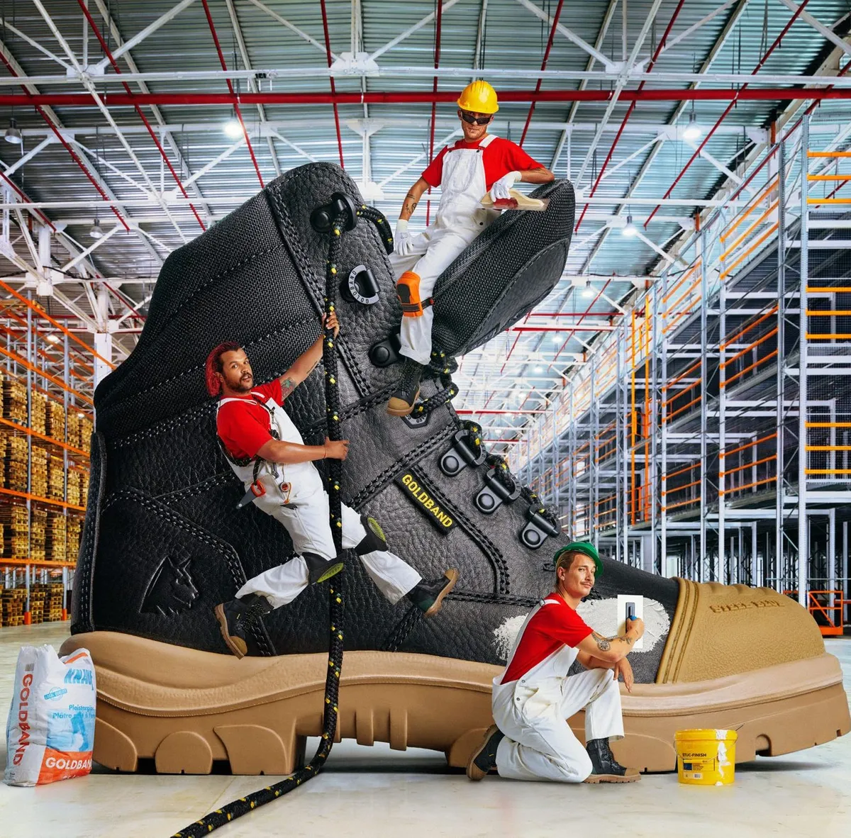 Ondertussen weten we allemaal dat het er HEEL stevig aan toe kan gaan bij shows van Goldband. Het Haagse trio is niet vies van een kolkende moshpit laten ontstaan, of dat nou in de AFAS Live is of op de zanderige festivalweide van Best Kept Secret. Al dat springen, trekken en duwen is leuk in het moment, maar de pijnlijke voeten en beurse tenen achteraf? Dat is minder. Gelukkig hebben de voormalig stukadoors samen met Steel Blue een heus paar Goldband-werkschoenen uitgebracht mét stalen neus. Ideaal voor de werkplaats én de moshpit!