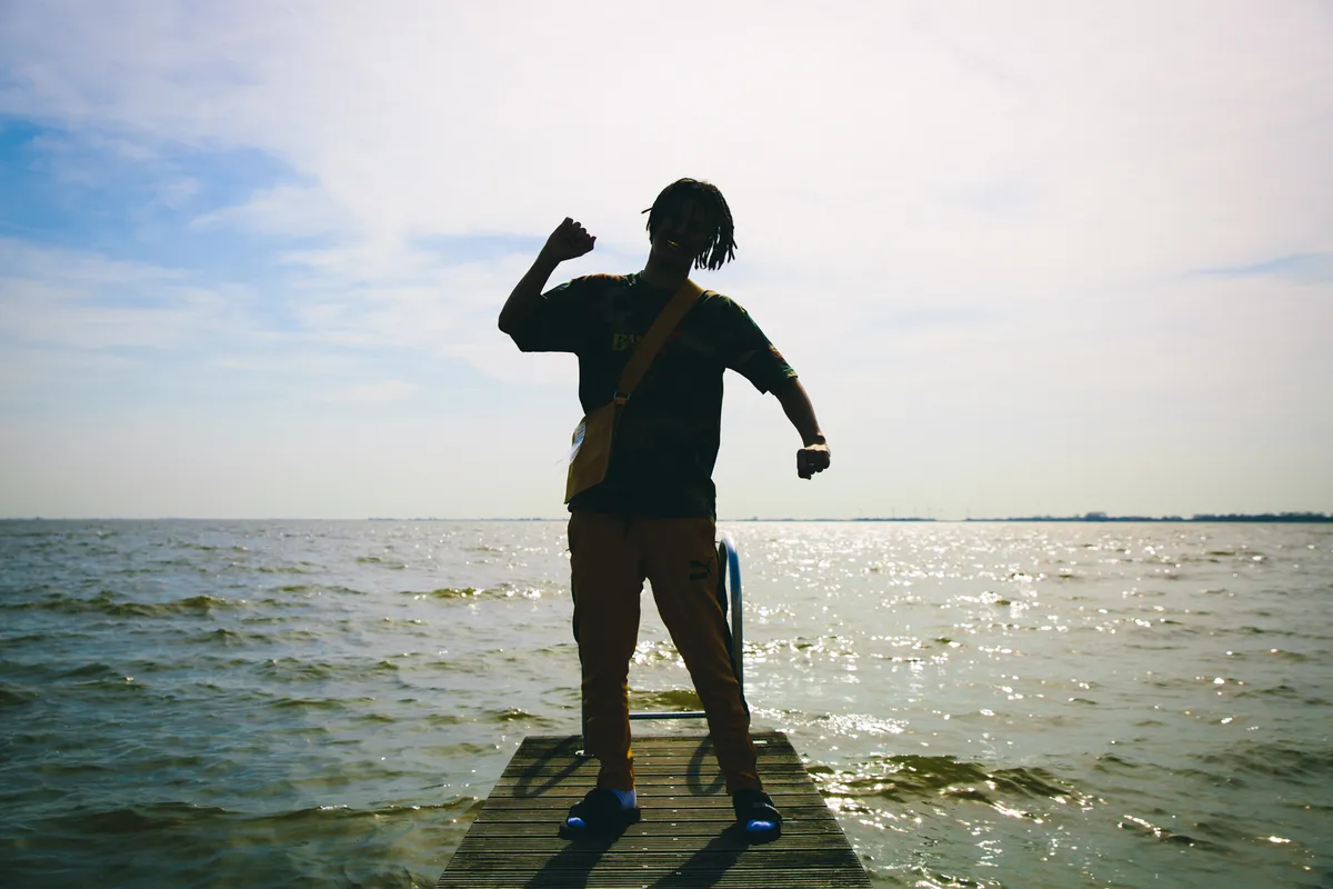 ‘Ja, juist toen is het ontstaan. Wanneer ik op shuffle een hiphop-playlist luisterde, hoorde ik: “I’m dying in the syrup.” “Kill niggas on the block!” M’n moeder is ziek en ik krijg dit te horen? Oh my god, dit is zo depressing. Toen kwam Lil Yachty met die happy vibes, en dacht ik: zie je wel, het kan ook anders. Toen pas ben ik me ook in Nederlandse muziek gaan verdiepen, en hoorde ik hoe vrolijk en apart Bokoesam kwam. Ik wilde dat ook proberen, maar dan nog sterker die kant op gericht: enjoy some more, ben niet bang om een skinny jeans te dragen, wees niet verdrietig, appreciate the sun. Een beetje mijn moeder vrolijk maken.’
