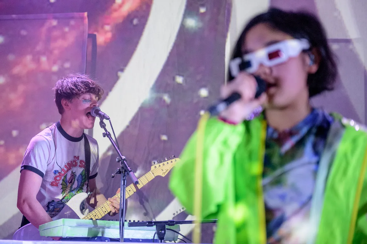 ‘We dachten dat we ons waarschijnlijk nooit allemaal in dezelfde ruimte zouden bevinden,’ vertelt Mark Turner, beter bekend als Emily, in een Amsterdamse hotellobby. Hij neemt de meeste synths en productie van Superorganism voor zijn rekening, en is precies zo opgewekt als je van een van de leden van dit circus zou verwachten. ‘We bedachten gewoon iets en zetten het online omdat we het cool vonden. Toen er ineens allemaal interesse ontstond, moesten we het A-Team bij elkaar brengen en een live show in elkaar klussen.’