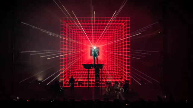 Het meest indrukwekkend is echter het lichtplan. Aan beide zijkanten van het podium is een immense stellage gebouwd met lampen die dwars over het podium schijnen en samen met de spots in de nok van de zaal een felrode kooi rond de band vormen. Op het lange LED-scherm achter de band staat een soort rooster van ontelbaar veel vakjes, waar gedurende de twee uur lange show van alles mee gebeurt. Het ene moment strekt het zich in optische illusies uit tot een eindeloze tunnel, het andere waaien de vakjes rond in een wilde wervelwind, tot ze uiteindelijk de wereldbol vormen die op de hoes van Bubble Gum prijkt. Ieder nummer krijgt de lichtshow die het toekomt, maar nergens verliest De Staat het geheel uit het oog.