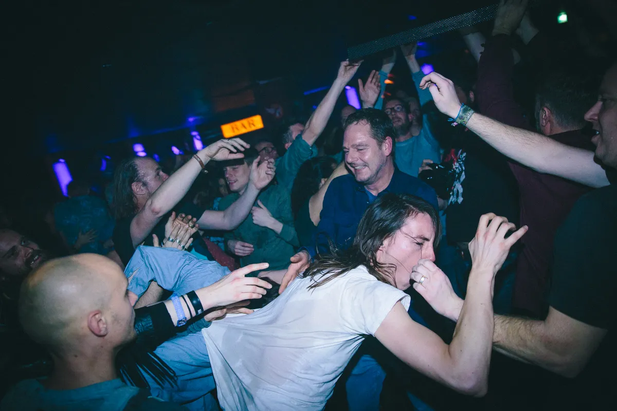 De jongens van Korfbal hebben vast hele leuke vrienden. Ze zijn het type dat al keihard de gitaarsolo van de pauzemuziek meebrult (Thee Oh Sees!) en vanaf de eerste tel gezellig meehossen. En de hele tijd Korfbal schreeuwen. Nee, bij de indierockgroep rond Dokkumer prins Jaap van der Velde (The Homesick en Yuko Yuko) en Marnix Visscher (Creepy Karpis en Fisscher Price) staan niet alleen stijve industrietypes, maar vooraan lijkt het vooral een heel erg leuk huisfeestje.
