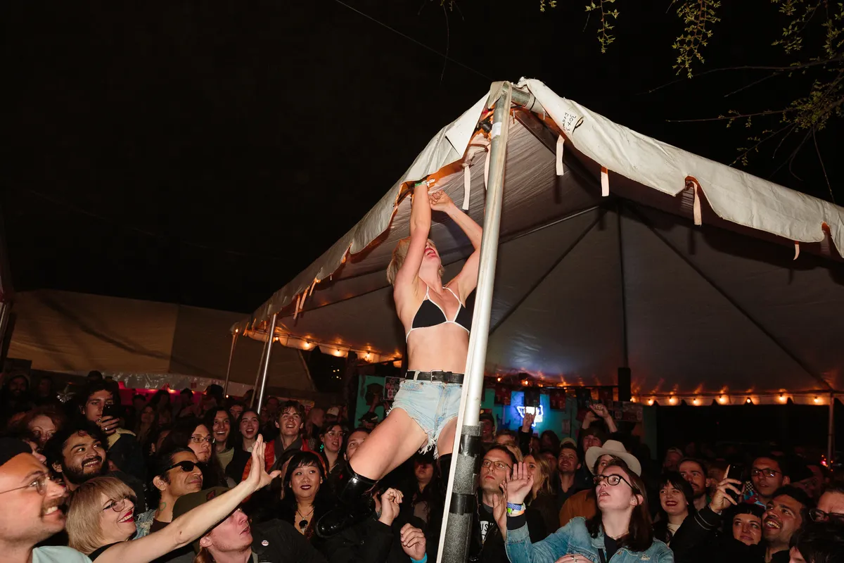 De prijs voor de leukste glitteroutfit van Austin gaat naar Eva Hendricks, de zangeres van Charly Bliss die er werkelijk uitziet alsof ze zo uit een van de mysterieuze glitterfabrieken is gerold. Zo laat ze hun powerpop en altrock met mega-catchy refreintjes nog net iets feller fonkelen.