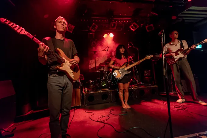 Ondertussen staat er bij de buren al een flinke rij. Voor de deuren van Rotown staat een paar meter volk te dringen voor Lewsberg. De Rotterdamse band presenteert op Motel Mozaique z'n debuutalbum, vol noisy popliedjes met een flinke dosis Velvet Underground. 'Mocht u in het bezit willen geraken van onze plaat, dan is deze achterin de zaal verkrijgbaar,' zo meldt frontman Arie van Vliet. Goed om te weten, want dat album is echt supercool. Net als deze show: Van Vliet, in witte polo en met lerarenmontuurtje op zijn neus, houdt zijn blik gericht op een enkele plek ergens anderhalve meter boven het publiek, terwijl hij stoïcijns zijn teksten prevelt. Ondertussen staat de gitarist diep voorover gebogen compleet atonale gitaarsolo's te piepen. Ronduit ongezellig en vreselijk tof.