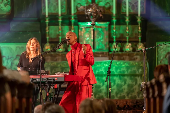 'Hoe christelijk zijn jullie hier eigenlijk? Niet echt hè?' In de Paradijskerk op de vroege zaterdagavond Nakhane op het programma. Tussen de oude stenen van de kerk is de lucht aangenaam koel. Een toepasselijke locatie voor de Zuid-Afrikaanse zanger: op zijn album You Will Not Die worstelt hij openlijk met de wrijving tussen zijn christelijke geloof en zijn homoseksualiteit. In een felrood satijnen pak maakt hij kronkelende dansbewegingen, zijn gezicht naar het altaar gericht. Een glimmende oorbel hangt onder zijn linkeroor. Zijn elektronische popsongs zijn meeslepend en soepel dansbaar, gezongen met een breekbare falsetto. Tussen al die zware emotionele lading houdt hij het gelukkig luchtig. Natuurlijk was Jezus een zwarte man, lacht hij: 'Hij werd vermoord zonder reden. That shit doesn't happen to white people!'