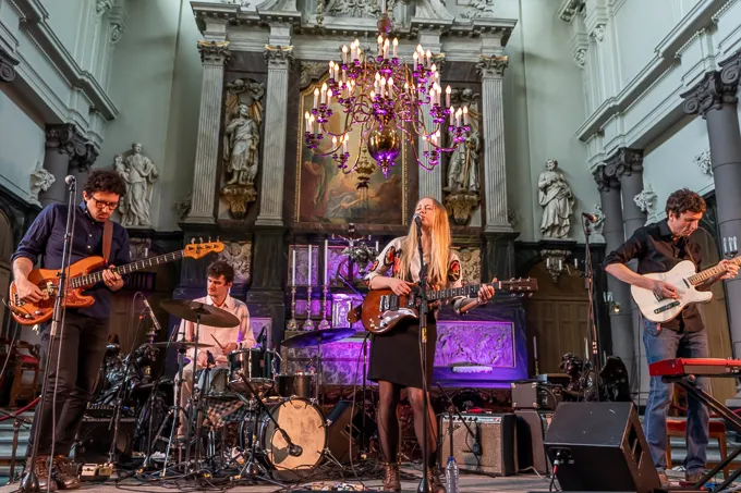 Als de hete dag verandert in een zwoele avond, worden de truien uit totebags gevist en de jassen van de heupen geknoopt. Onder een boog in de knusse Armeniuskerk heeft Wye Oak zich genesteld, klaar om de laatste festival nacht in te luiden. Een dichte kluwen mensen heeft zich met twinkelende oogjes om het duo heen verzameld, bovenin prijkt een balkon. De band uit Amerika is inmiddels al tien jaar actief en heeft begin deze maand hun vijfde album uitgebracht, ze doen dan ook hun uiterste best om zoveel mogelijk nummers in de setlist te proppen. Het lukt ze zonder de laid-back vibe die er in de kerk hangt te verpesten. Aan de randen is het wat luidruchtiger, maar dat stoort het mini-universum dat de twee in de kern van de kerk hebben gecreëerd niet.