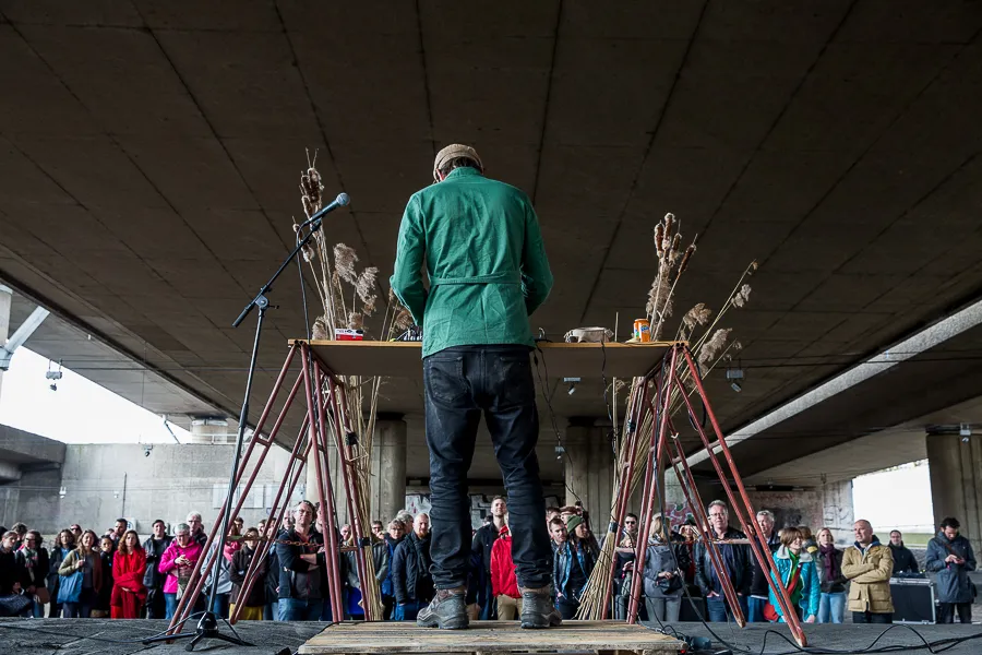 Op z'n best is de Zeeuws-Vlaamse muzikant Tonnie 'Broeder' Dieleman in staat met alleen zijn stem en wat vogelgeluiden je mee te voeren naar zijn belevingswereld. Op Motel Mozaïque trad hij vandaag op onder het drukke Kleinpolderplein, terwijl links, rechts en boven auto’s voorbij raceten. Vanachter zijn eenvoudige, wiebelende tafel trapte Dieleman af, de diepe tonen en natuurgeluiden volgden, maar de echte magie bleef uit. De zware bas en Dielemans wat monotone zang sloegen dood tegen de hoge betonnen muren van het verkeersknooppunt. Leuk idee, en aan Dielemans inzet en talent lag het niet, maar de uitdagende setting tussen het verkeer en de aandachtseisende visuals zaten het optreden enigszins in de weg. Jammer. (Fabienne Poot)