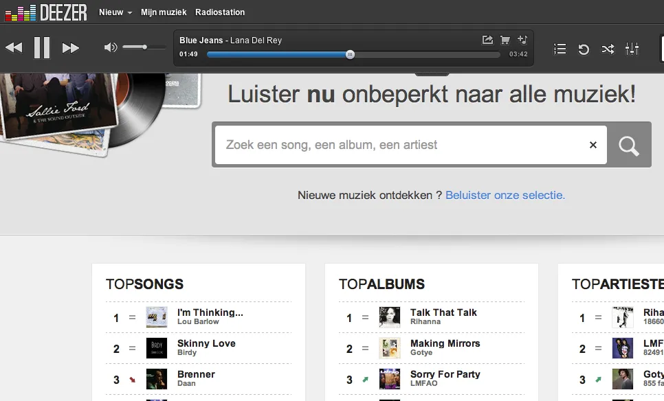 Deezer is een oorspronkelijk Franse muziekdienst, die sinds 8 december ook in Nederland beschikbaar is. Het bedrijf kondigde onlangs aan uit te breiden naar Canada, Australië en Nieuw-Zeeland en zou in alle 46 Europese landen actief zijn. Deezer laat Japan en Amerika naar eigen zeggen aan Spotify en richt zich nu meer en meer op Europa. Het bedrijf is volgens de eigen gegevens 's werelds grootste muziekdienst: met 20 miljoen gebruikers en 15 miljoen nummers van tweeduizend labels. Deezer is daarmee twee keer zo groot als Spotify.