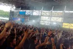 In de veel grotere techno-stage UFO I zien we drie techno-vijftigers achter elkaar. Eerst Donato Dozzy, die met Voices of the Lake staat te fistpumpen op steeds stevigere techno, zelfs duiveltjes vormt met zijn vingers. Het mooist zijn eigenlijk hun buildups: gas terugnemen. Laag ronkende bas. Snareroffeltje. Hihatworkout. Kick eronder. Eindeloos bouwen. Bouwen. Bouwen! En dan pas inlossen met acid. Weergaloos, en meermaals stijgt er een dik gejuich op tussen de rookmachines en strobes. Dan de 51-jarige Berlijnse techno-veteraan Efdemin, die een keihard doorrollende trein bouwt in de booth, moderne hardgroove vol fluitjes laat horen en werkelijk niet te stoppen is. En Richie Hawtin, de minimal-grootheid die hier een AV-productie meeneemt voor een set van nauwelijks langer dan een uur. De spanningsboog is dus wat korter, die repetitieve minimal-patroontjes lopen niet eindeloos door maar worden wat explosiever ingezet. Leuk en aardig, maar eigenlijk is het visuele gedeelte van deze show een beetje suf.