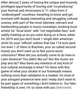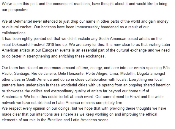 Ondertussen heeft Dekmantel gereageerd op de post van Valesuchi: “We zijn er terecht op gewezen dat we geen Zuid-Amerikaanse artiesten op de voorlopige line-up van Dekmantel Festival 2019 hebben geplaatst. Hierbij bieden we onze excuses aan. Het is ons nu duidelijk dat het uitnodigen van Zuid-Amerikaanse artiesten op onze Europese evenementen een essentieel deel uitmaakt van de culturele uitwisseling, en dat we ons beter moeten inzetten om deze uitwisselingen te versterken.”