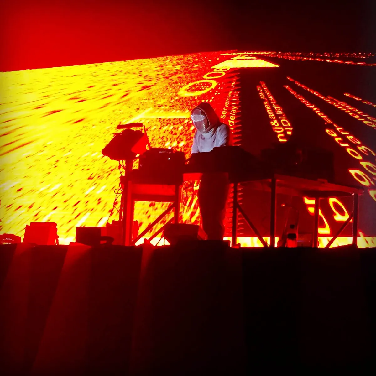 Maar het slot van de dag is voor Squarepusher, een buitenbeentje pur sang. De Engelse IDM-producer heeft normaal gesproken eigenlijk helemaal niets te zoeken op een festival als dit, en dat maakt het juist een spannende boeking. Hij staat in de tent waar het de hele dag het hardst gaat, de enige tent waar techno de hele dag regeert. Het is er donker, en op het grote visualscherm zien we er grijze wolken, terwijl buiten het zonnetje zachtjes door de bomen blaast. Je zou zeggen dat ze in deze tent wel wat gewend zijn, maar Squarepusher jaagt binnen een paar minuten zijn halve tent leeg. Dat was te verwachten, en toch kun je zijn komst hierheen wel een succes noemen. Squarepusher staat in een schermpak achter zijn apparatuur, terwijl eentjes en nulletjes als lava vanaf het scherm over hem heen rollen. Uit zijn apparatuur tovert hij hypersnelle, drum ’n bass achtige beats, maar dan abstracter. Zijn nieuwe album Damogen Furies is weer een test voor iedere liefhebber van experimenteel experiment: hard en snel, ontdaan van iedere aardse betekenis, zonder sexy melodieën of aansprekende refreintjes. Dan gaat het masker af en pakt hij zijn basgitaar erbij. Wat ie achter de knoppen precies doet weet je niet, dat hij verbluffend kan bassen kun je simpelweg zien. Als een volleerd publieksmenner staat Squarepusher de mensen op te jutten, en zo laat hij zien meer concessies te kunnen doen dan zijn labelgenoten van Autechre een dag eerder. Hij wil er hier graag bij horen, en dat is wederzijds.