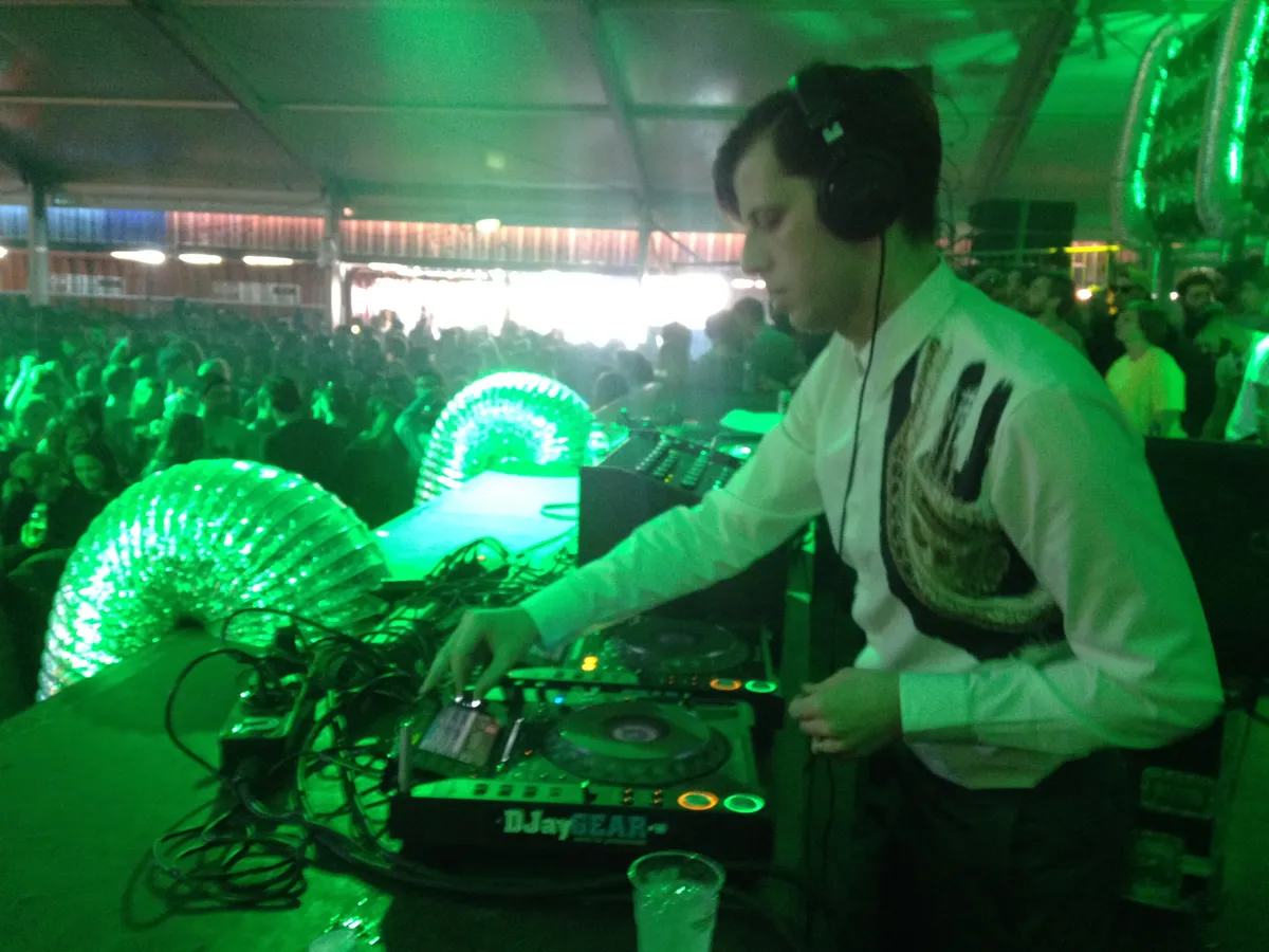 Inmiddels is een onopvallende portacabin op het terrein opeens begonnen vuur te spuwen en lopen mannen met robots boven hun hoofd over het terrein. In de zaal van De Sluwe Vos steken twee dames de neuzen nog even bij elkaar. De Sluwe zelf is heel even weg achter zijn draaitafels, maar zodra hij terug komt geeft hij een ruk aan de knoppen en zwaait hij zijn armen in de lucht. Eigenlijk is hij een hele gekke dj vergeleken met de rest. Sluwe mixt heel snel na elkaar nieuwe platen in, zoals een Rustie of Ganz dat zou doen. Waar bijna overal vandaag geduld van je gevraagd wordt, duwt hij alles recht in je gezicht. Hij switcht ook, van house naar techno naar een flard hiphop, en als afsluiter zelfs een Skream remix van La Roux. Anders dus, en zeker niet subtiel, maar het werkt hier erg goed.