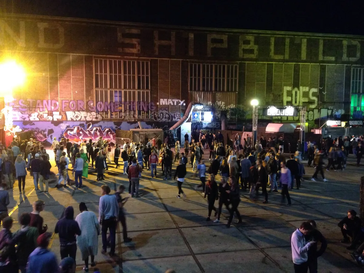 En zo gaat het eigenlijk al een paar dagen. Het lijkt onderhand wel ADE, zeker ook met het aantal buitenlanders dat de NDSM-werf heeft opgezocht. Zouden sommigen van hen al dagen van feestje naar feestje lopen? Bij Barnt staat een grote groep Engelsen vooraan, onmiskenbaar. Een Frans meisje vraagt of je een foto van haar en haar vrienden wilt maken, terwijl je het biertje van een Spanjaard even vast mag houden omdat hij even iets wil breken.