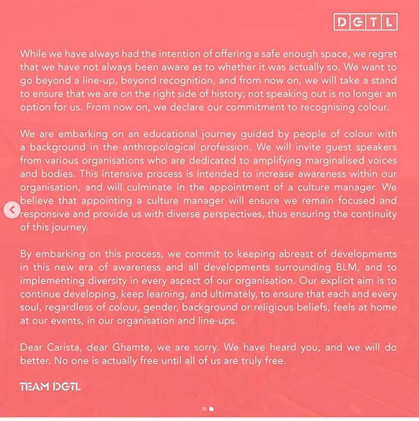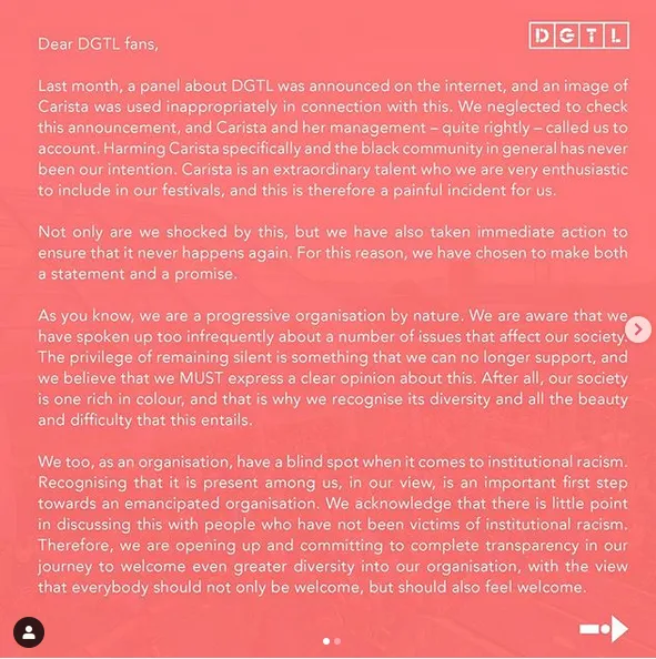 Directe aanleiding voor het statement is een social media controverse die uit juli dateert, toen DGTL samen met zeilfestival SAIL meedeed aan een panel bij cultureel centrum Pakhuis de Zwijger. Ter promotie van het evenement werd een foto van de toonaangevende dj Carista gebruikt, die weliswaar bij DGTL heeft gedraaid maar niks met het panel te maken zou hebben. Via Instagram sprak ze zich uit over het gebruik van haar foto. Manipulatief en lui, vond ze het. Wat haar betreft was het een schoolvoorbeeld van de manier waarop organisaties vlaggen met een divers imago, zonder zich daadwerkelijk in te zetten voor diversiteit. Net zo pijnlijk was het feit dat haar foto was gepositioneerd naast een foto van een SAIL-zeilschip. Haar volgers merkten op dat dat wel erg veel weg had van een koloniaal schip en vroegen zich af waarom dat niemand was opgevallen; de klap op de vuurpijl. De foto werd offline gehaald toen Carista en haar manager bij de organisaties aan de bel trokken, maar Carista's volgers waren verontwaardigd dat de betrokken organisaties geen statement hadden gemaakt.