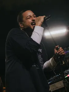 Live brengt hij dat met een virtuoze 6-koppige band, die in een ontspannen jamcirkel om hem heen staat. Hijzelf middenvoor in het witte licht, omringd door synths, samplers. De rest heeft ook al zo’n berg gear aan de voeten, en gaan daarmee weer totaal aan de haal met de arrangementen: ‘FIRE’ bijvoorbeeld, met z’n maniakale sounddesign een nogal bizarre compositie om live te spelen, klinkt live gevoelsmatig nog intenser, uitgebouwd met een Boards of Canada-esque outro. 'Many Times' wordt veel opgefokter gespeeld, en die geweldige gitarist op links? Die pakt bij oudje ‘Rodeo Clown’ ook nog eens de klarinet erbij.