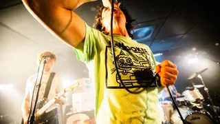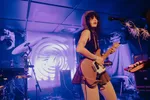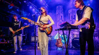 Gitarist Victor ter Veld en bassist Tom Radsma maaien wild met hun instrumenten, ze lijken die grunge-popnummers fysiek door de ruimte te willen smijten. Zangeres Abir Hamam oogt alsof ze een Oscarbeeldje komt ophalen, maar staat aan het einde van de avond ook te springen en te maaien op haar naaldhakken.
