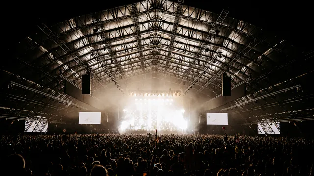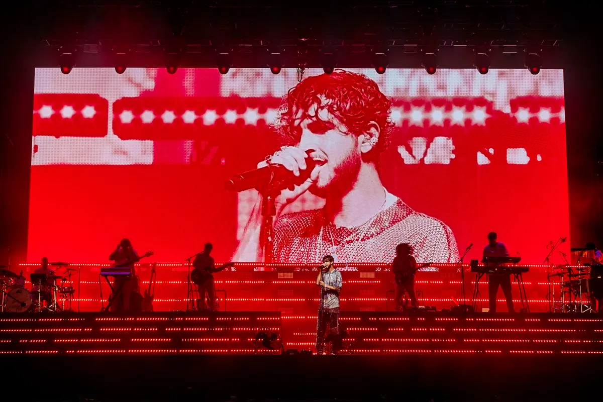 Max Colombie ziet er vandaag een beetje moe, maar vooral zielsgelukkig uit. We kunnen iedere minuscule gezichtsuitdrukking volgen, want het LED-scherm over de volle breedte van het podium schakelt nergens weg richting de bandleden en toont non-stop zijn gezicht close-up. We zien hoe hij in zichzelf gekeerd giechelt in ‘Fever’, we zien hoe hij zo hard moet lachen dat hij in ‘You’re Mine’ bijna niet meer kan zingen.