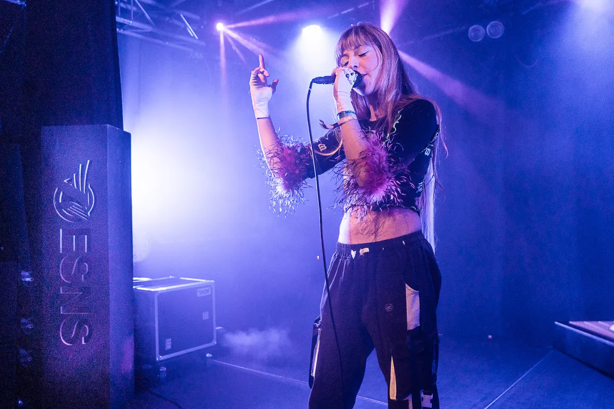 Een heel peloton aan LED-schermen, weerspiegelende platen, de whole shebang: Naaz was beloofd dat ze haar hele Carré-productie zou mogen meenemen naar Eurosonic. Helaas is een showcasefestival een showcasefestival: teleurstellingen, aanpassingen, snel schakelen, hectiek hectiek hectiek. Dus doet de Nederlandse zangeres uiteindelijk een ietsjes uitgeklede show, eentje die een tikkeltje wankel begint maar al gauw echt raakt. Het is haar allereerste optreden met band in drie jaar tijd, ze trok zich terug uit de muziekindustrie die haar zo had beschadigd en uitgeknepen. En dat was het gekke: we kenden Naaz als een mega-enthousiaste spring in ’t veld, maar ondertussen maakte ze dingen mee die je NIEMAND gunt. Met haar comeback durft ze haar héle zelf te presenteren, haar hartverscheurende verhalen naast de vrolijke rock ’n roll-kant die ze ook heeft. Ze heeft een paar ontzettend leuke bangers (‘subliminal message’ en ‘sad violins’) maar vooral ‘kche baralla’ en ‘azadî’ raken: Koerdische nummers waar een ongelooflijke tristesse van uitgaat. Die laatste neigt bijna naar de triphop, en wordt door haar band extra uitgerekt, ze spelen 'm eerst solo met piano en daarna met hele band.