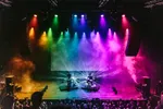 Midden in de pandemie bracht de Rotterdamse postpunkband zijn album Excerpts From Chapter 3 uit, een energiek maar soms ook filmisch aandoend album. En dus moest er een film komen, een soort hallucinante concertfilm zonder publiek, met dansers, gemaskerde figuren en spookachtige nonnen die extra backing vocals toevoegen. Welnu: dat project voert de band nu eenmalig op het podium uit, in de Schouwburg. Dat is best een beetje wennen - we zijn gewend met een pintje in de hand mee te dansen op de stuwende bassen - maar juist de meer spookachtige kalme stukken komen nu beter tot hun recht. Een gigantische oogbol kijkt ons aan van links op het podium, terwijl meisjes in rode gympakjes hun benen strekken. Waar je in een film alle controle hebt over de montage, voelt dit een beetje als een behind the scene uitvoering, waarbij elke disbalans zichtbaar is. Maar als kijker heb je wel veel meer vrijheid om te kijken waar je wilt.