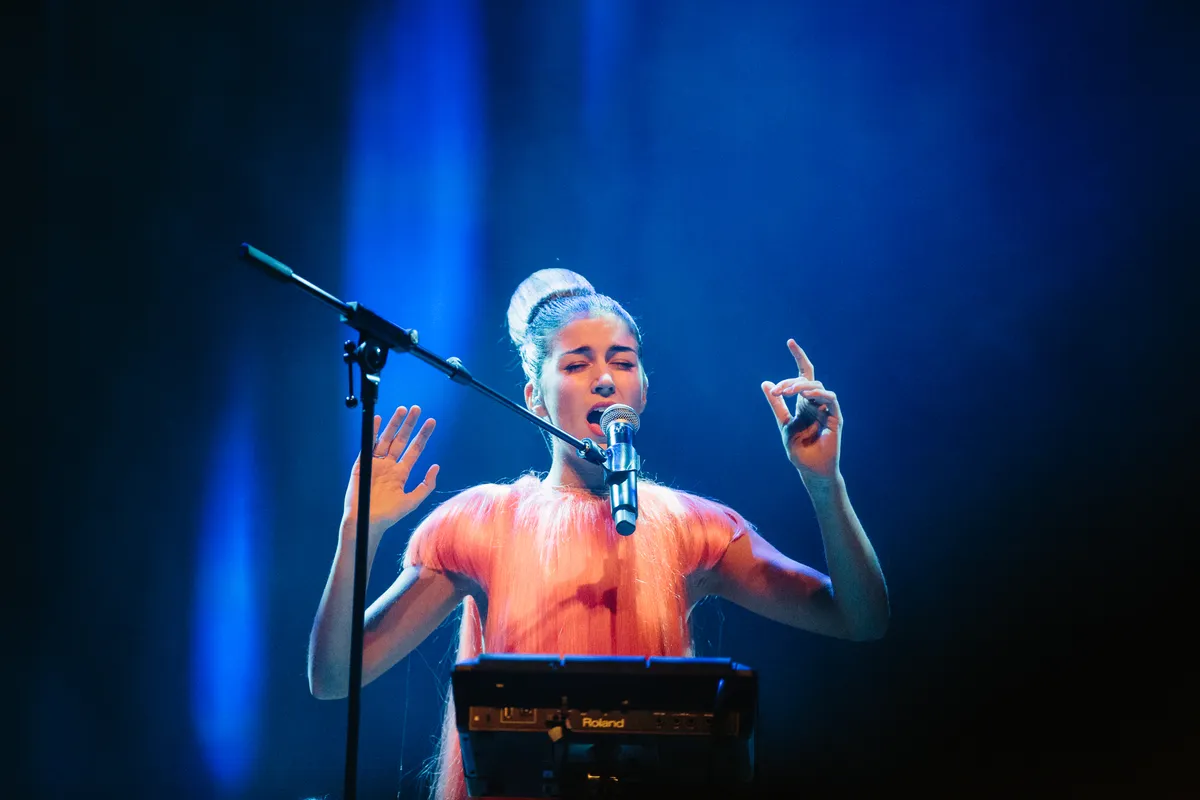 Marina Herlop heeft een speelse blik in haar ogen, vaak zelfs een beetje ondeugend. In principe maakt ze nogal ingewikkelde muziek: ze speelt razendsnelle klassiek georiënteerde pianomotiefjes, liet zich ook inspireren door Zuid-Indiase klassieke muziek, zingt zangerige piephoge melodieën in een veelal zelfverzonnen taaltje (en haar twee achtergrondzangeressen geven die woorden nog eens extra vleugels), maar er klinken ook diepe subbassen en het geluid van kletterende zwaarden. En toch, door haar performance (in een maf jurkje van roze haren?!) blijft het behoorlijk toegankelijk allemaal. Die vocale acrobatiek doet wel wat denken aan Björk soms, of FKA twigs zonder de pop.