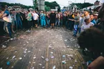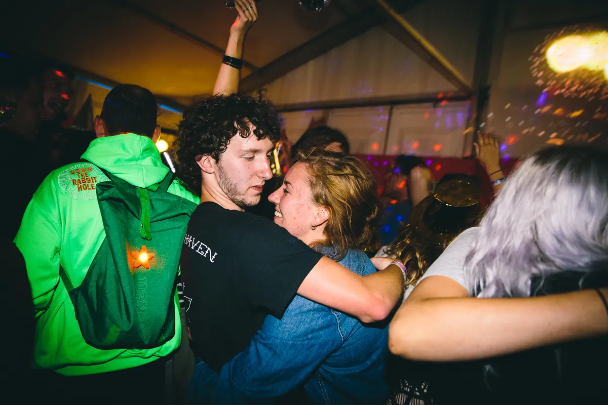 Schaterlachend doen Hunee en Daphni een wedstrijdje om wie het hardst kan dansen op de platen van de ander. Opvallend hoe goed ze elkaar aanvoelen, terwijl het nog maar de tweede keer ooit is dat ze samen draaien. Dat de hele tent de laatste uren van het festival wegdanst, was te verwachten. Maar wat staat die security-gast voor het podium geconcentreerd aan zijn arm te frunniken? Is er iets mis? Oh nee, hij doet een glowstick om, om vervolgens te gaan shufflen alsof zijn leven ervan afhangt.