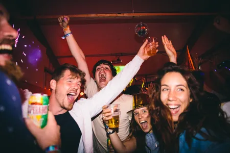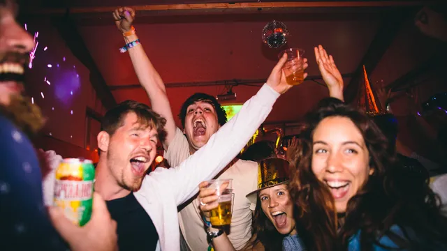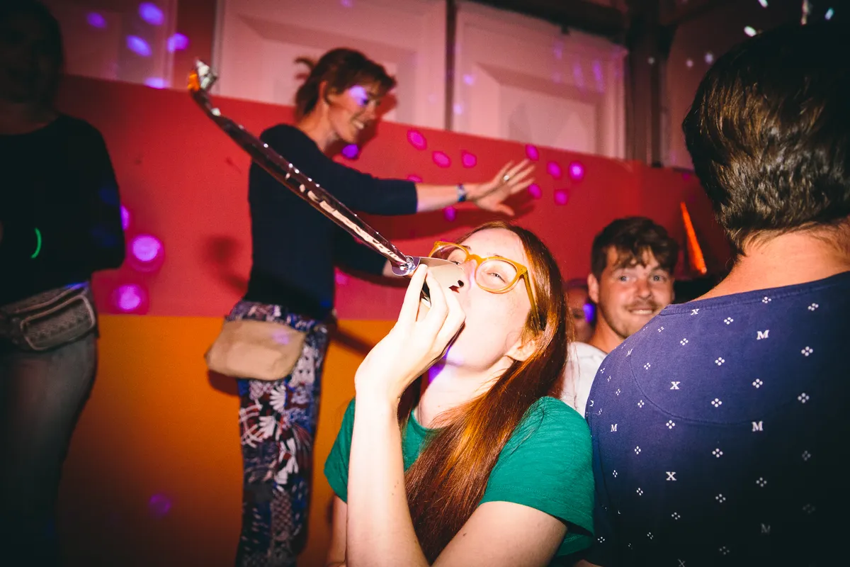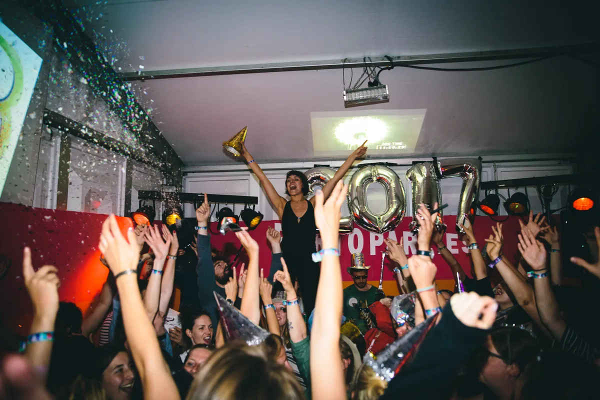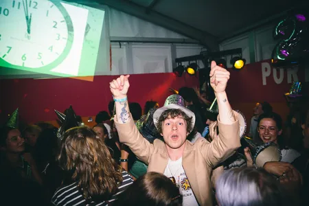 Wat een krankzinnige pleuriszooi zijn de portoparties het hele weekend: drie keer per dag worden de meest bizarre huisfeestjes gehouden in een tweetal cabins – feestjes die zijn gepitcht door het publiek, en de besten zijn uitgekozen. Dan weer vingerverven, dan weer moshpit, dan weer Jedi training en dan weer skinny disco dip (ja echt). Het beste werkt de Nieuw Jaar-generale. Elke paar minuten wordt afgeteld, er is goedkope bruiswijn, er zijn feesttoeters en er is een schuimkanon. Meebrullen met Queen en ABBA, en wildvreemden omhelzen je met drie smakken om je het allerbeste te wensen. Superkut natuurlijk, maar juist daarom zo leuk.