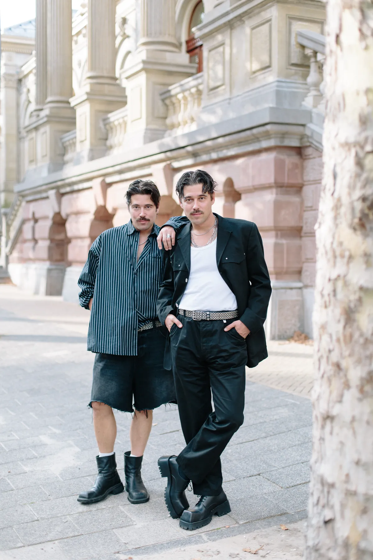 Vervolgens verkastte de tweeling naar Amsterdam. In eerste instantie als stagiairs van Bas Kosters, de enfant terrible van de modewereld die sterk gelinkt is aan discodinosaurus Joost van Bellen, met kleding vol schreeuwende kleuren en heel. Veel. Piemels. Maurice: ‘We hadden vanuit Friesland de trein naar Amsterdam gepakt omdat Peaches optrad tijdens Noodlanding, in Paradiso. We ontmoetten Bas bij de toiletten, heel toevallig, en raakten aan de klets. Hij vroeg ons: “Hebben jullie een stageplek nodig? Nou, kom volgende week maar langs!” We zijn met onze naaiwerkjes naar hem toe gegaan, die helemaal nergens op sloegen. Zo zijn we Amsterdam binnengekomen, en zo zagen we dat muziek en mode samen kunnen gaan.’